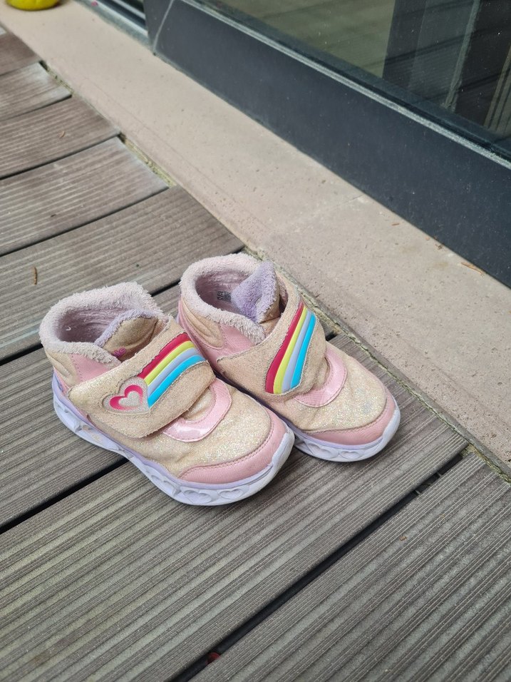 Pembe pastel renkli, cırt cırtlı bantlı, gökkuşağı ve kalp detaylı kız çocukları için spor ayakkabı/bot. İçi peluş. Kullanıma bağlı kirlenmeleri ve simlerin bazı kısımlarında silinmeler var. Kullanıma engel değil, simli kısımların üzerinden simli oje ile geçilirse hem kiri kapanır hem de yepyeni olur. Işıklarının 1 teki yanıyor 1 teki yanmıyor. O nedenle çok çok uygun yazıyorum.
