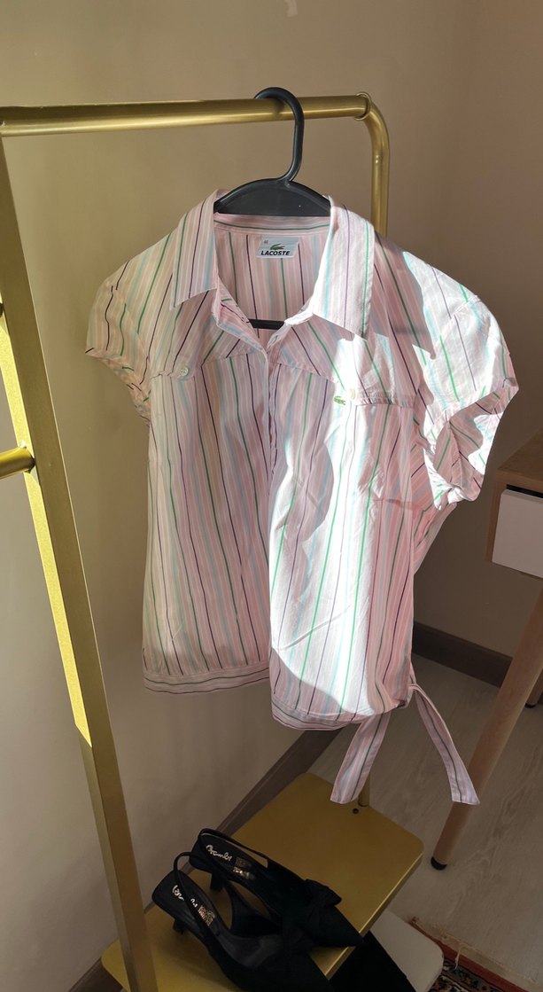 Pembe çizgili, kısa kollu, yakalı ve bol kesim kadın gömleği. Belde bağlama detayı vardır. Yumuşak pamuk kumaştan yapılıdır