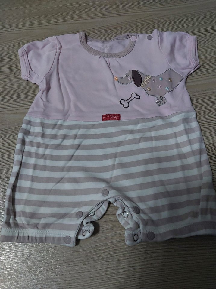 Pastel pembe renkte, baskılı köpek desenli, düğmeli bebek kız tulumu. Yumuşak kumaş, çizgili alt ve kısa kollu.