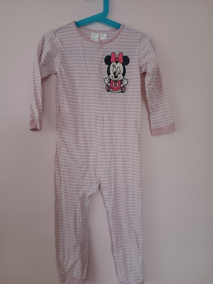 Pastel pembe renkli, düğmeli uzun kollu bebek kız tulumu, göğsünde Minnie Mouse baskısı bulunur.
