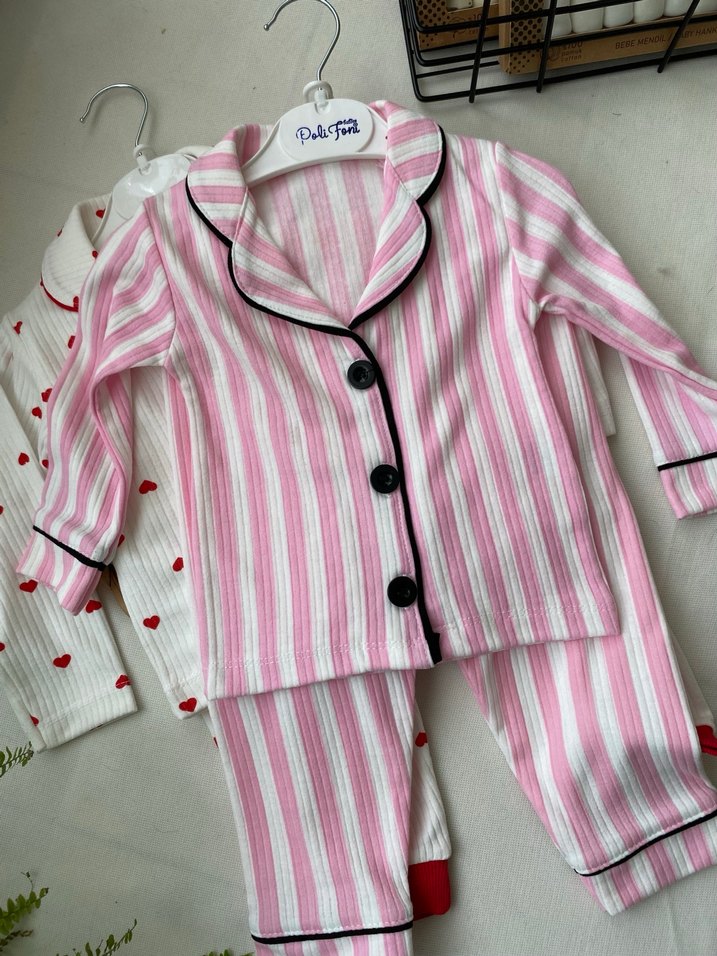 Uzun kollu, normal kesim, yakalı pembe çizgili renkli bebek pijama takımı, midi boyda.