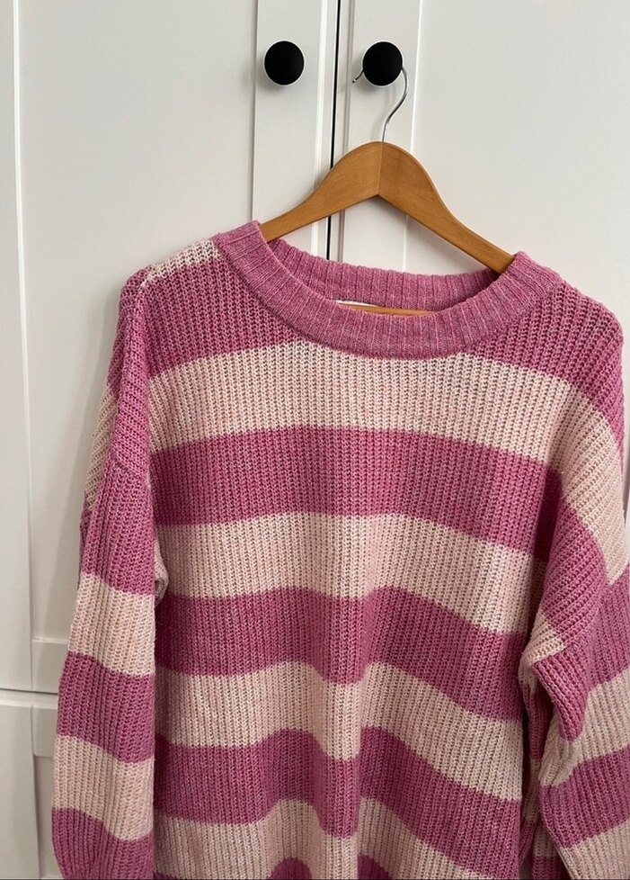Pembe ve krem çizgili, yuvarlak yaka ve uzun kollu bohem tarzda, rahat kesim kadın triko kazak. tertemiz 1 kere giyildi