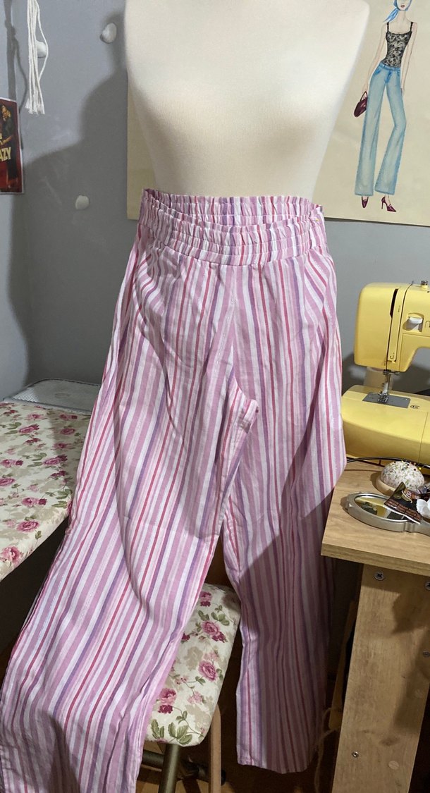 Pembe çizgili, pileli, bol kesim midi uzunlukta kadın kumaş pantolon. Rahat ve retro bir normcore tarzı sunar.