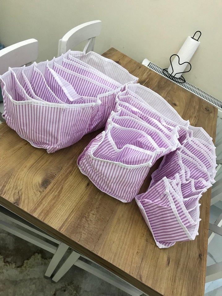 Pembe çizgili kumaştan yapılmış 3lü dolap düzenleyici set, raflarınızı düzenli tutmak için idealdir. Kullanmadığım için satıyorum temiz ve sorunsuz 2tanesi 8 cepli 24x18x36 cm 1 tanesi 11 cepli 16x12x42 cm