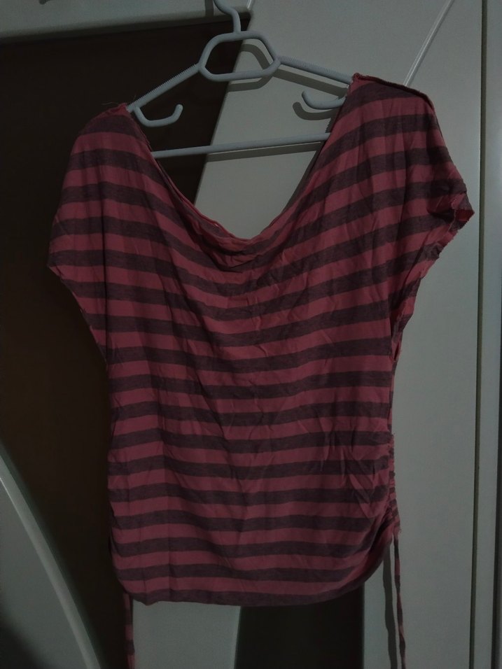 Pembe çizgili hamile bluzu, drapeli kayık yaka ve askılı kollara sahiptir. Rahat kesimi ve normal midi boyu ile yumuşak pamuklu kumaştan üretilmiştir.
