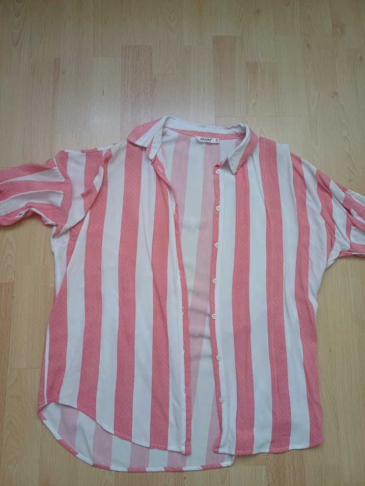 Pembe beyaz çizgili, uzun kollu, düğmeli ve salaş kesim kadın gömleği. Yumuşak sentetik kumaştan, normal boyda, günlük sokak stili için uygundur.