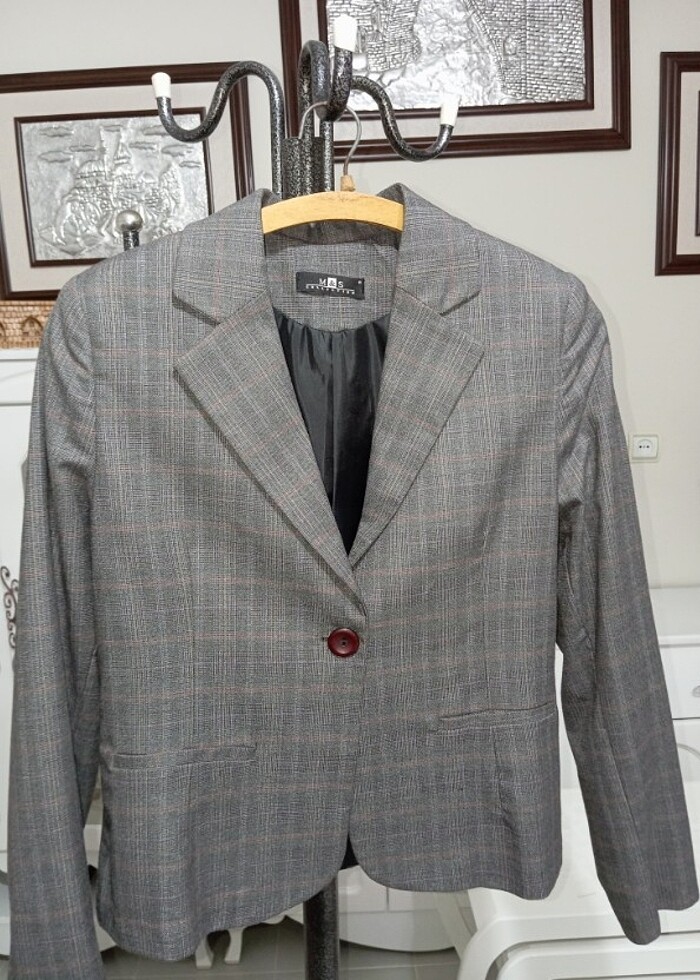 Pembe çizgili gri blazer ceket