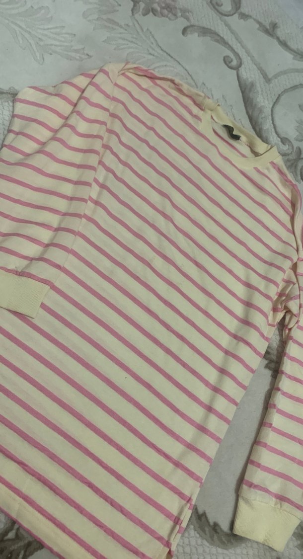 Pamuk kumaştan, uzun kollu ve yuvarlak yaka hamile tişörtü. Gevşek kesim, pastel pembe çizgiler ve düğme detaylarıyla günlük kullanıma uygun. Bir defa giyindim