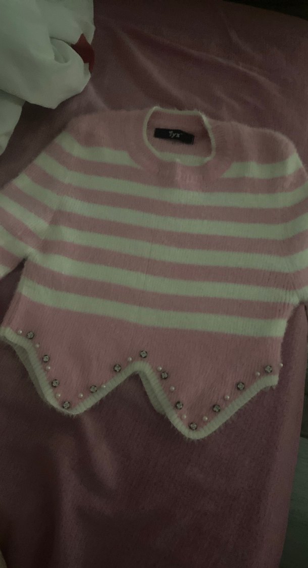 Pembe Çizgili İnci Detaylı Kısa Triko Kazak