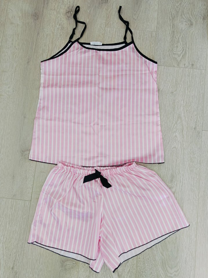 Pembe çizgili, ip askılı üst ve şorttan oluşan, rahat kalıplı kadın pijama takımı. Pastel tonlarda, konforlu tasarım.