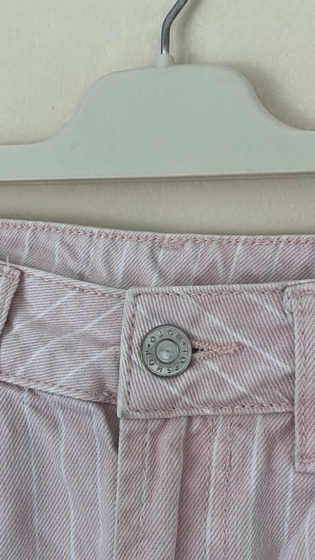 Pastel pembe çizgili kot, normal boy midi kadın pantolonu yani kaval kemiğine kadar gelen vintage yazlık bir parça. Rahat kesimiyle günlük sokak stiline uygun. Kemerinin orada küçük bir kusuru vardı belirttim görseller arasında