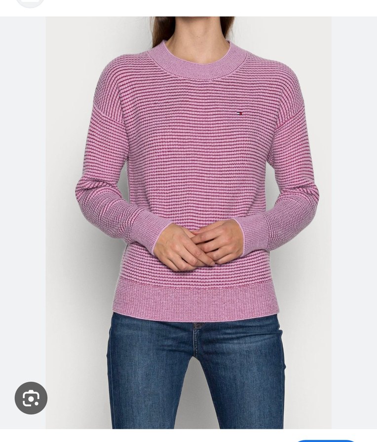 Pembe çizgili, yuvarlak yaka ve uzun kollu pamuk örgü kazak, rahat günlük kullanıma uygun düzenli kesim ve normal boyda.