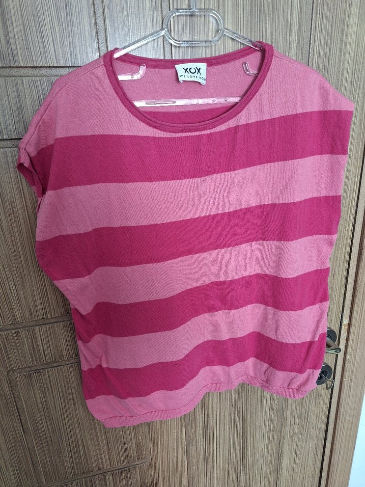 Pembe renkli, yuvarlak yaka ve kısa kollu kadın tişörtü. Örgü dokulu, baskılı çizgili desene sahip, sentetik kumaştan üretilmiştir. Rahat kesim, günlük sokak stili için uygun. marka temsilidir