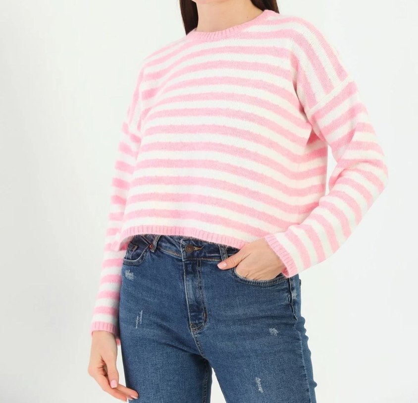 Pembe çizgili, yuvarlak yaka ve uzun kollu triko kazak. Bol kesim, örme dokulu ve denim kumaştan, günlük sokak stili için uygundur.