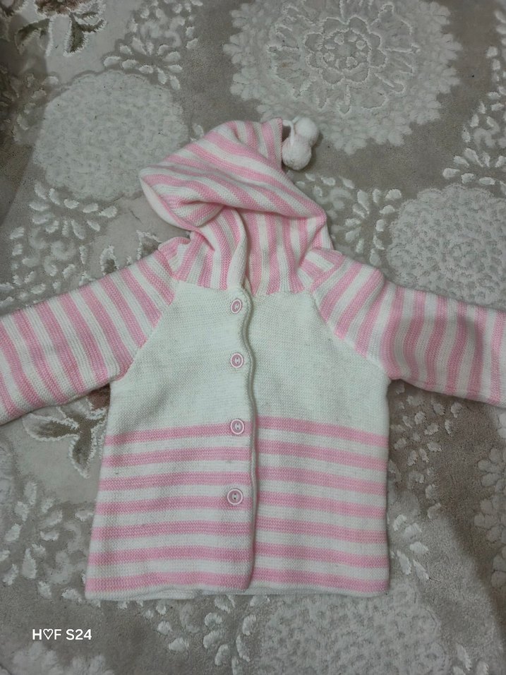 Pembe beyaz çizgili, kapüşonlu ve düğmeli, uzun kollu, fitted kesim örme kız hırkası. Yumuşak ve pastel tonlarda tasarlanmıştır.