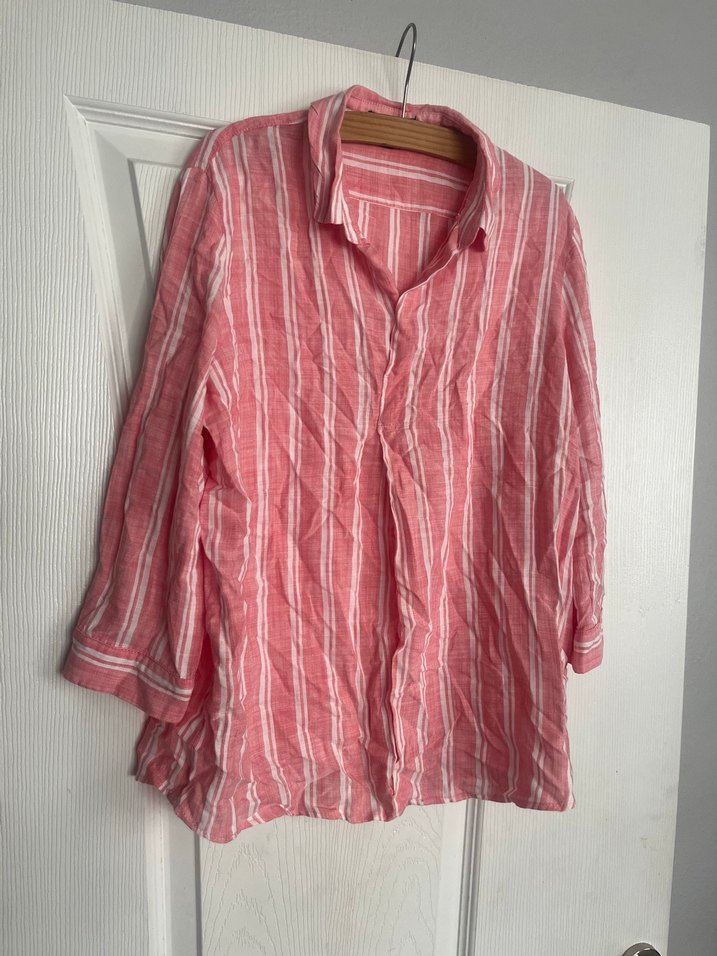 Pembe keten gömlek, uzun kollu, düğmeli ve çizgili desene sahip. Salaş kesimi ve kayık yaka ile günlük kullanıma uygun.