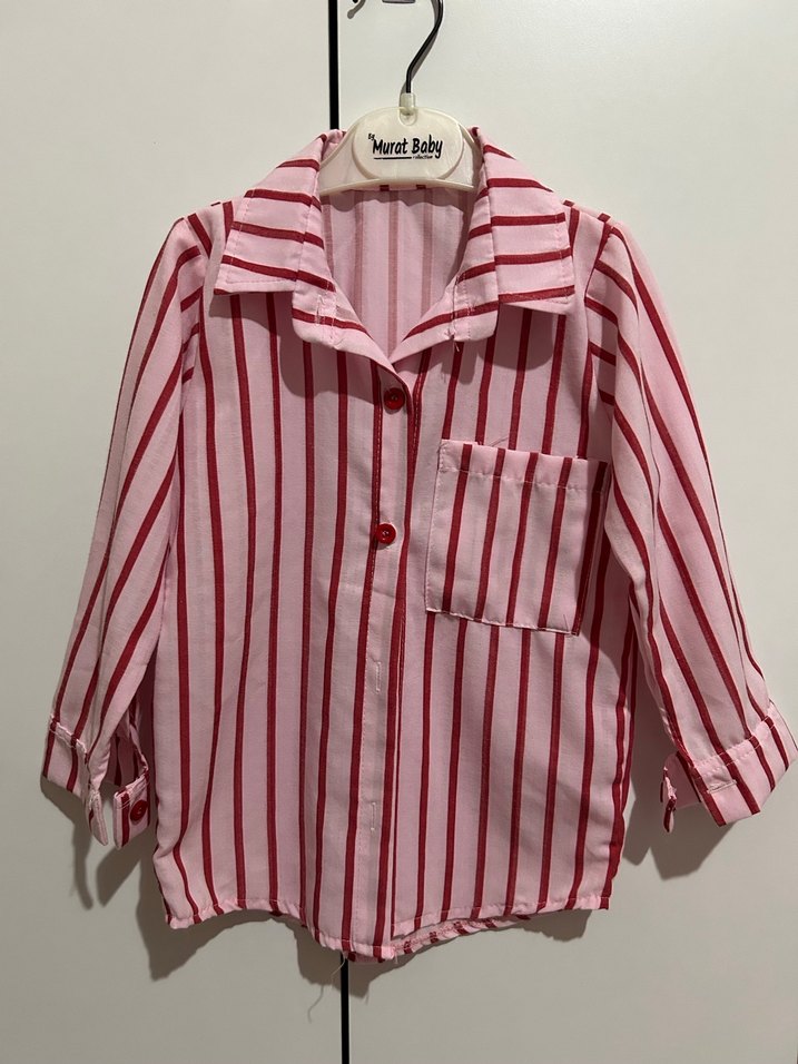 Uzun kollu, düğmeli, keten kumaştan yapılmış, pastel pembe çizgili, kısa ve bol kesim kadın gömleği. Notched lapel yakalı, rahat sokak stili için uygun. 2-3 yaşa olur diye düşünüyorum
