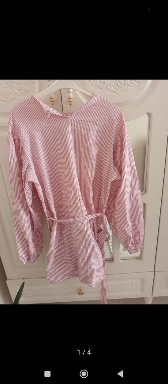 Pembe çizgili keten tunik uzun kollu.Düğmeli ve belden bağlamalı, rahat Paris sokak stilini yansıtıyor.