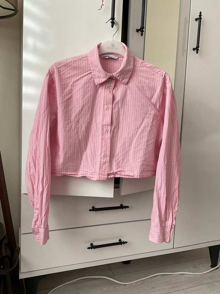 Pembe çizgili keten gömlek, uzun kollu ve yakalıdır. Düğmeli ön kısmı ve midi boyu ile günlük rahat kullanıma uygundur.