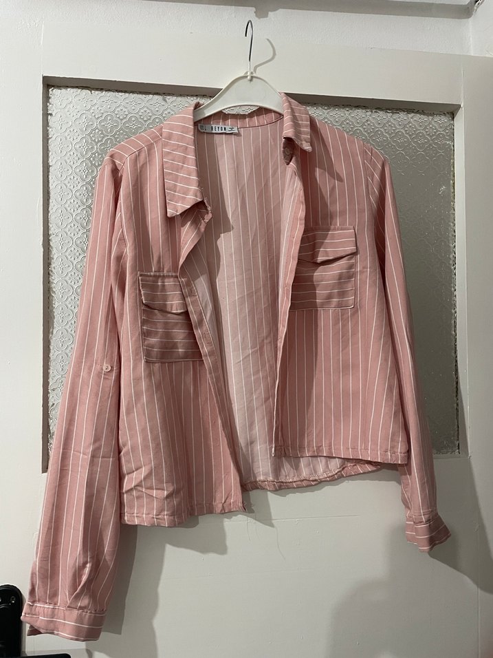 Pembe çizgili uzun kollu kadın gömlek, kısa kesim ve düğmeli ceplerle regular fit sunar. Sentetik kumaştan, günlük rahat sokak stili için uygundur.