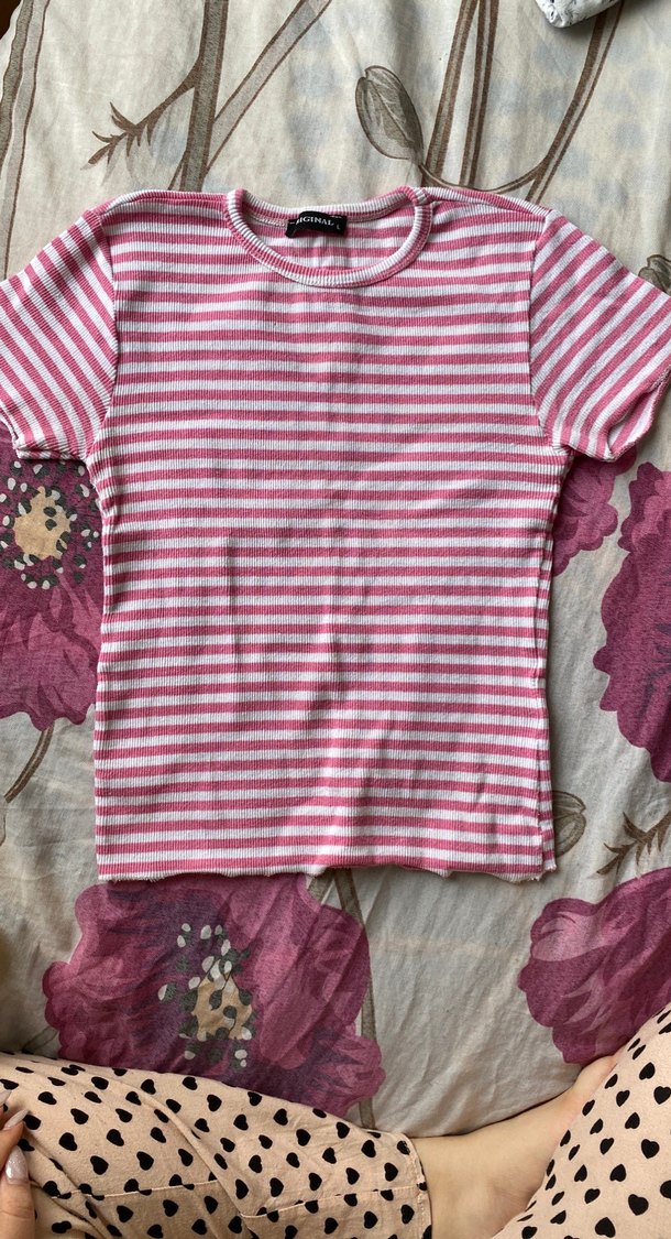 Kız çocukları için kısa kollu, bisiklet yaka ve düğmeli detaylı pembe çizgili, ince kesim tişört. Yumuşak sentetik kumaştan, trend sokak stili için uygun.