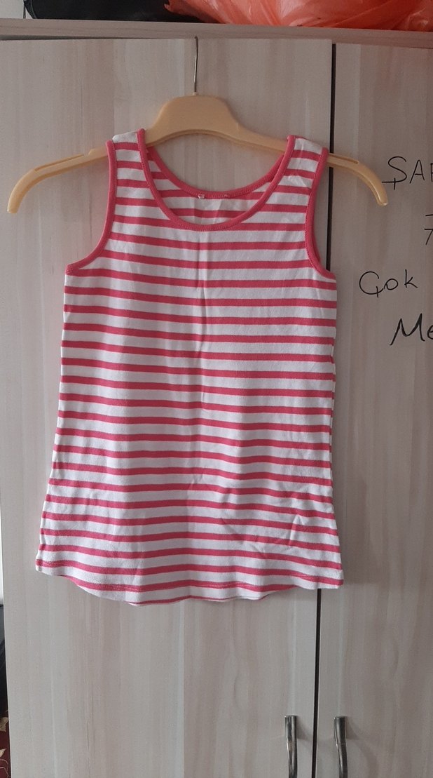 Pembe ve beyaz çizgili kız çocuk atlet, kolsuz ve yumuşak kumaştan üretilmiştir. M bedendir ve rahat kullanım sağlar.