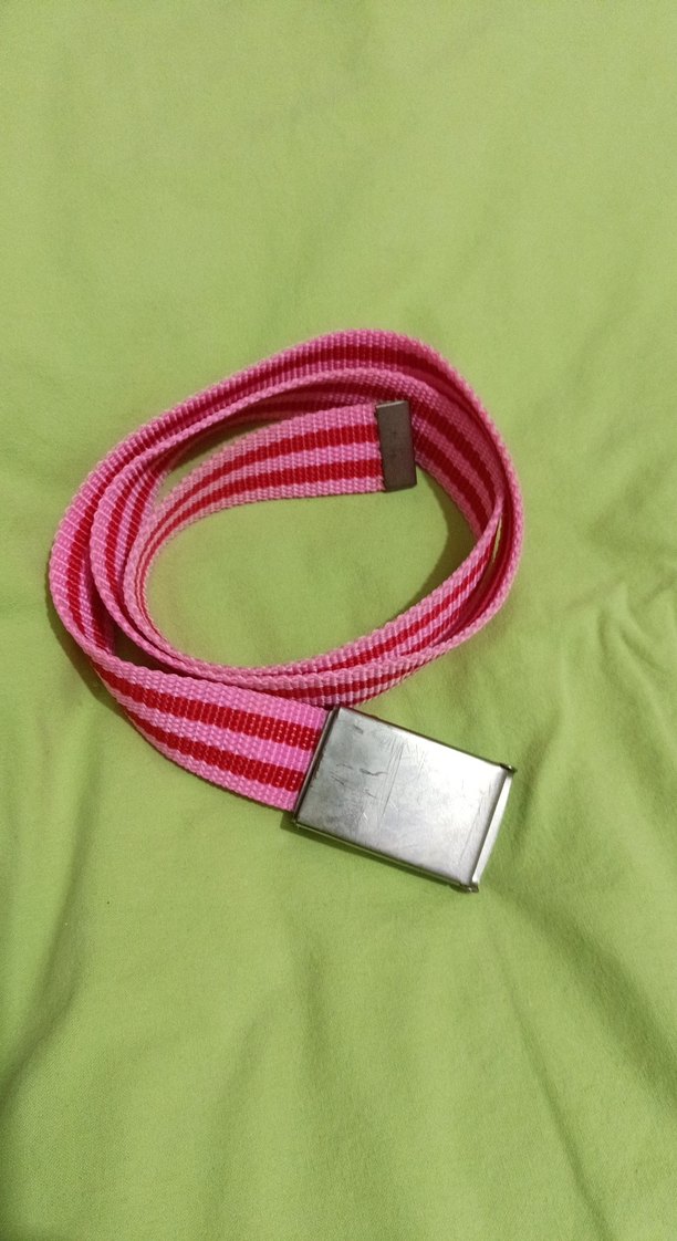 Pembe çizgili kumaş ve metal tokaya sahip kız çocuk kemeri. Minimalist ve sade tasarımlı, temel stiller için uygun.