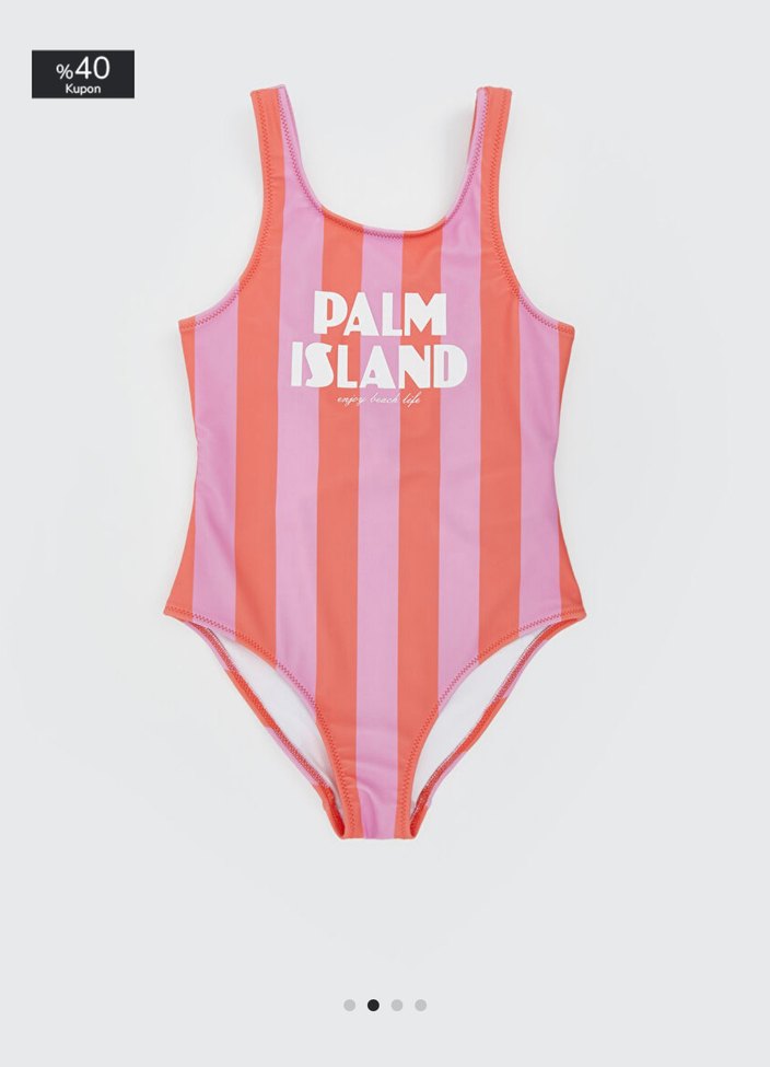 Pembe ve mercan renklerinde çizgili, pop kültür baskılı kız çocuk mayosu. İnce askılı ve plaj için uygun. ️