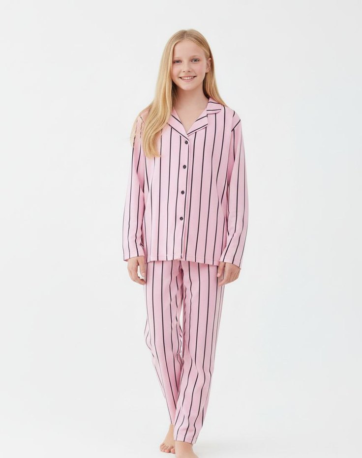 Pembe çizgili pijama takımı, uzun kollu ve rahat kesimlidir. Konforlu ve sade normcore tarzıyla evde dinlenmeye uygundur.