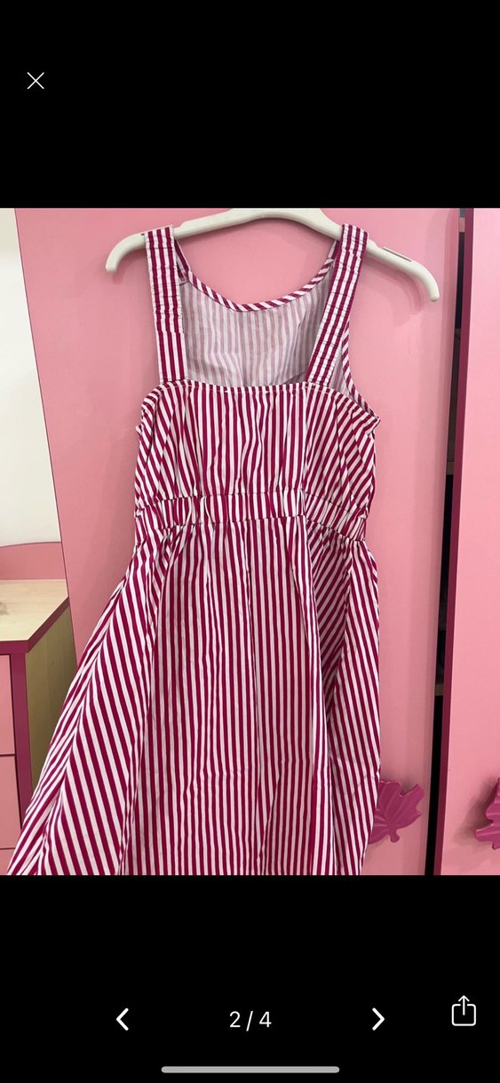 Pembe çizgili, askılı kız elbisesi, pileli detaylı ve tekne yaka tasarıma sahip. Bohem tarzı için uygun, hafif ve şık bir model.