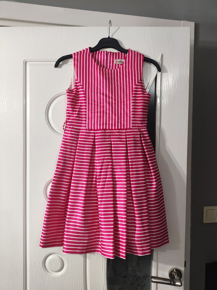 Pembe renkli, çizgili ve pilili etekli kolsuz kız elbisesi. Straplez yakalı, dar kesim ve sentetik kumaştan üretilmiştir.