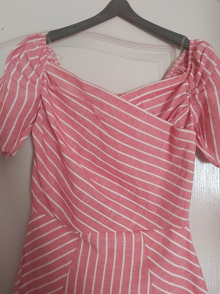 Yumuşak keten kumaştan yapılmış, drapeli ve askılı kollu, tekne yaka pembe çizgili elbise. Vintage tarzı ve sokak giyimi havası taşır.Kalıbı dar, L beden gibi. Bel:40 cm Koltuk arası 50 cm,Boy:84 cm