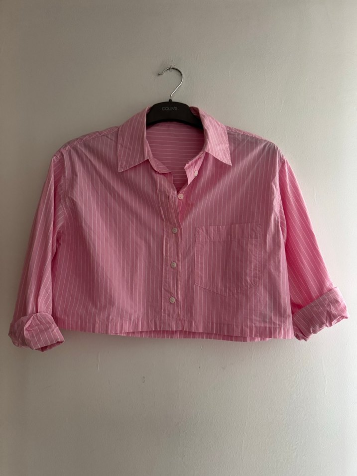 Pamuklu, pastel pembe çizgili, uzun kollu, yakalı ve düğmeli kısa kesim gömlek. Salaş kesimiyle trend sokak stiline uygun rahat bir parça.