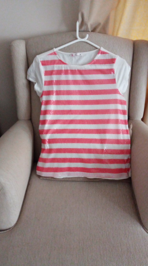 Kadın için kısa kollu, yuvarlak yakalı, pastel pembe çizgili ve pullu, pamuklu kumaştan yapılmış dar kesim tişört. Sokak stili için uygun. Koltuk altı 47 cm ve boyu 62 cm
