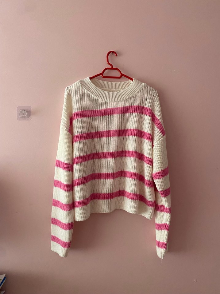 Bu kadın kazak, uzun kollu ve yuvarlak yaka olup, gevşek kesim ve pembe beyaz çizgili örgüdesiz. Rahat ve günlük kullanım için uygun, yumuşak örgü kumaştan yapılmıştır. M L beden için uygundur