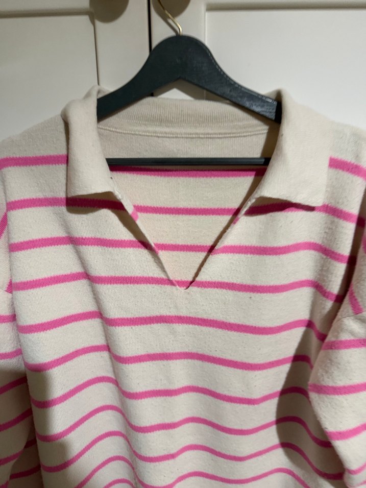 Yumuşak yün kumaştan, yakalı ve uzun kollu, pembe çizgili örgü kadın kazak. Salaş kesim ve normal boyda, günlük sokak stili için uygun.