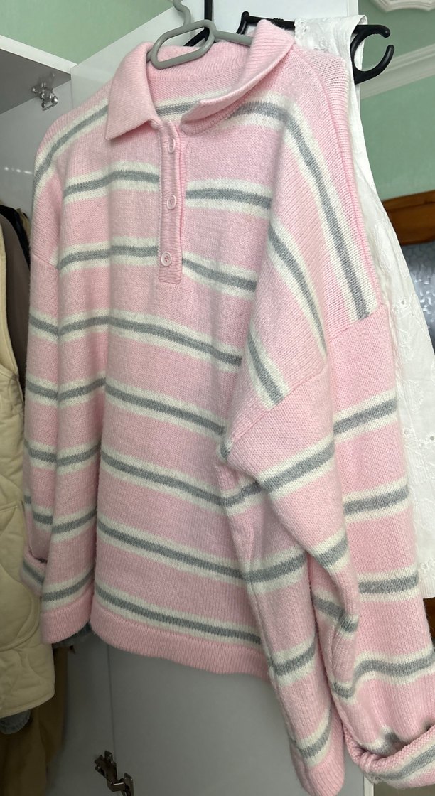 Pastel pembe renkli, çizgili, uzun kollu ve yakalı örgü kadın kazak. Salaş kesimi ve midi boyuyla günlük rahat sokak stili için uygundur.