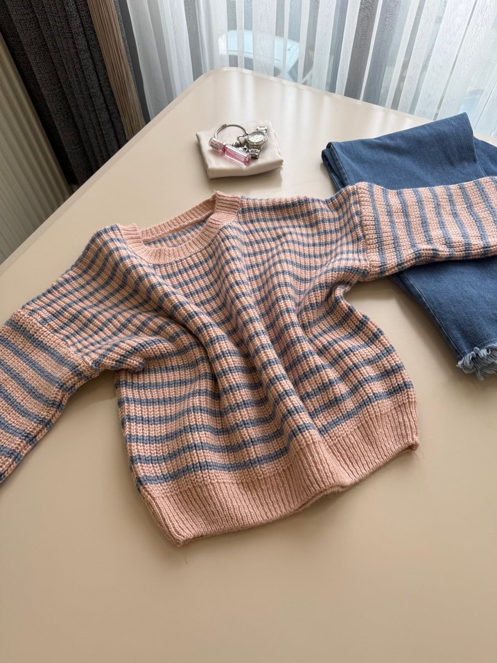 Kadınlar için loose fit, yuvarlak yaka ve uzun kollu örgü kazak. Pastel pembe ve gri çizgili deseniyle rahat günlük kullanım sunar.