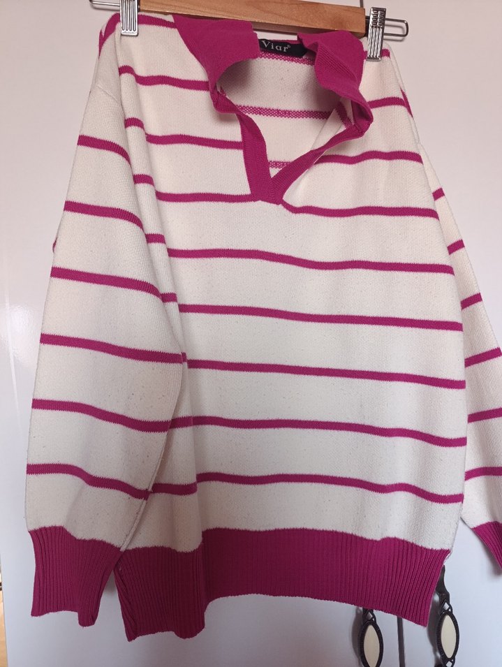 Gevşek kesim, tekne yaka ve uzun kollu kadın kazak. Beyaz zemin üzerine pastel pembe çizgilerle örgü kumaştan, rahat ve günlük sokak stili için uygundur.