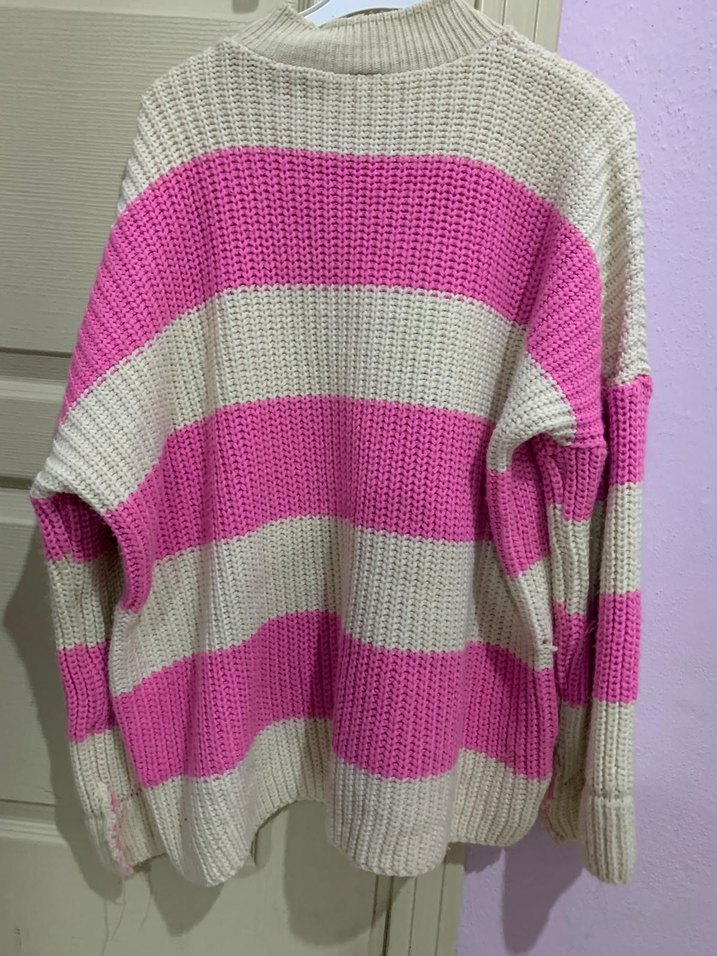 Pembe ve krem çizgili, örgü kumaştan yapılmış, uzun kollu ve boğazlı, bol kesim rahat bir kadın kazak.