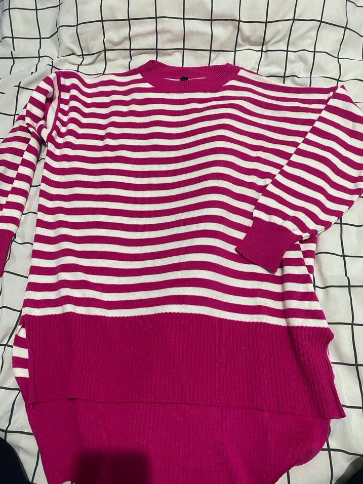 Rahat kesim, uzun kollu, pembe-beyaz çizgili örme kadın kazak. Bisiklet yaka ve normal midi uzunluğa sahip, günlük kullanıma uygun rahat ve şık bir parça.