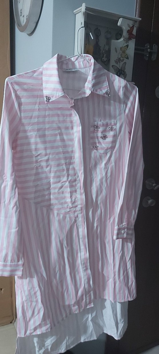 Pembe çizgili pamuklu gömlek, uzun kollu ve düğmeli. Normal boyda, regular fit ve yakalıdır. Cep ve yakada süs düğmeleri bulunur. tertemizdir