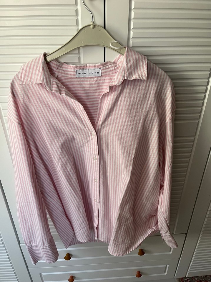 Uzun kollu, yakalı ve düğmeli pembe çizgili pamuklu gömlek. Normal boy ve rahat kesimle günlük kullanım için uygundur.
