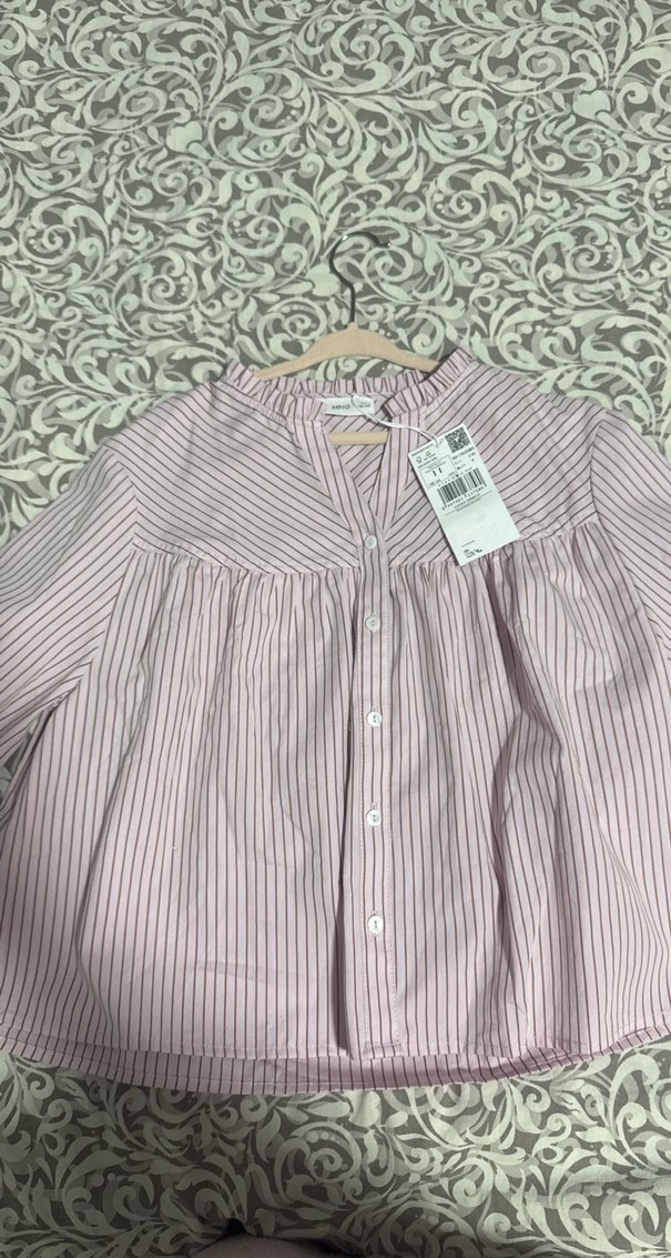 Pamuklu, uzun kollu, V yaka ve fırfır detaylı bol kesim gömlek. Pastel pembe çizgili baskıya sahip, gündelik kullanıma uygun.