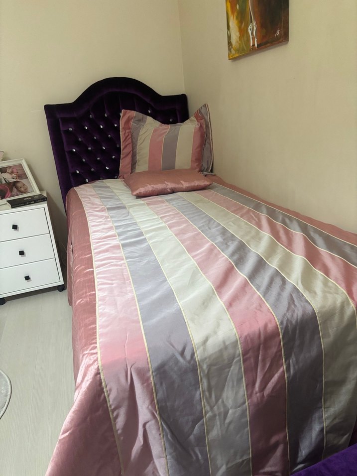 Yumuşak kumaştan yapılmış, çizgili desenli pastel pembe yatak örtüsü ve uyumlu yastık kılıfları. ️