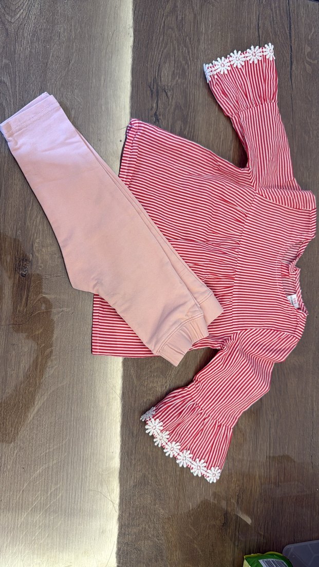Uzun kollu, çizgili ve pilili üst ile çiçek dantelli kenar detaylı, pastel pembe taytlı bebek kız takımı.