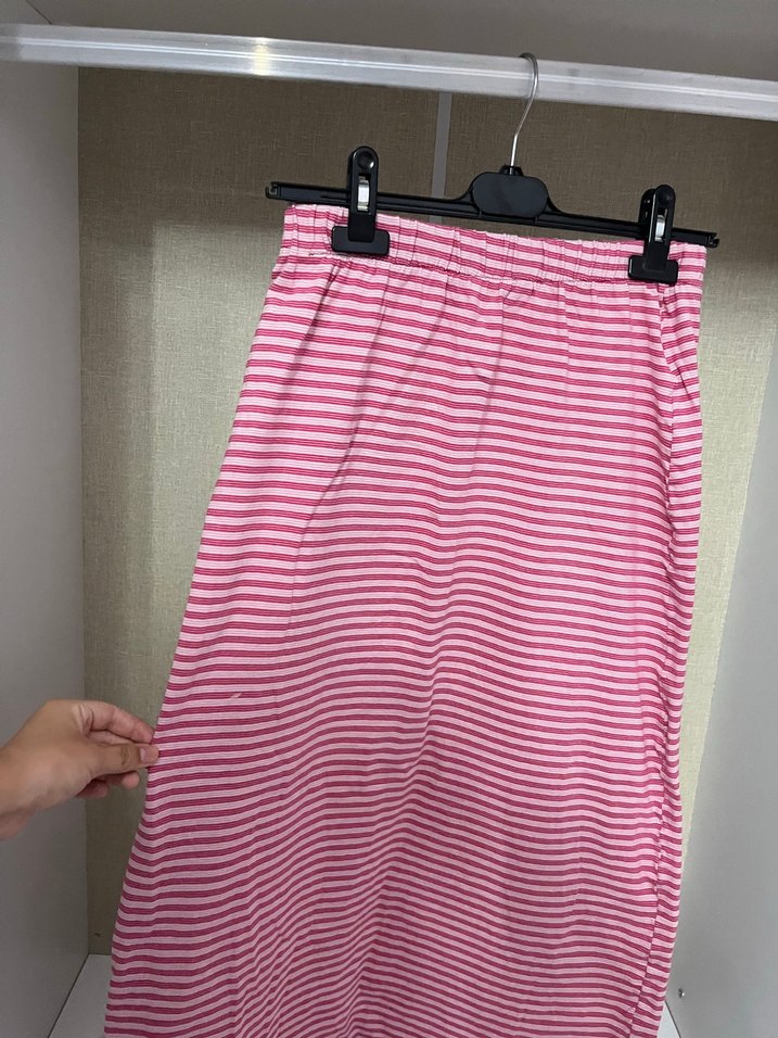 Hafif pembe çizgili, piliseli ve vücuda oturan midi etek, rahat sentetik kumaştan üretilmiştir.