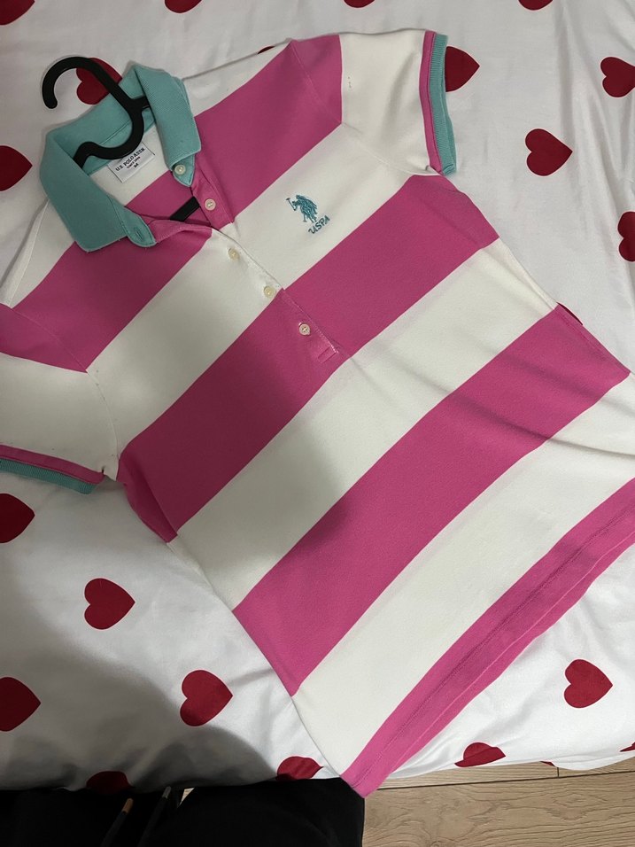 Düğmeli polo yakalı, kısa kollu, pamuklu kumaştan yapılmış, pembe-beyaz çizgili, dar kesim kadın tişörtü. Rahat ve şık günlük kullanım için uygundur.