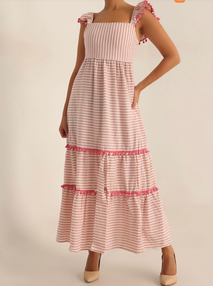 Pembe Çizgili ponpon şeritli uzun elbise