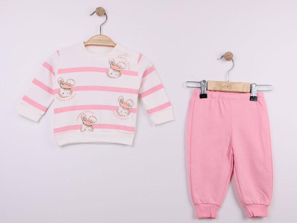 Pastel pembe ve beyaz uzun kollu, tavşan desenli örgü üst ve pembe örgü pantolonlu bebek kız takımı.
